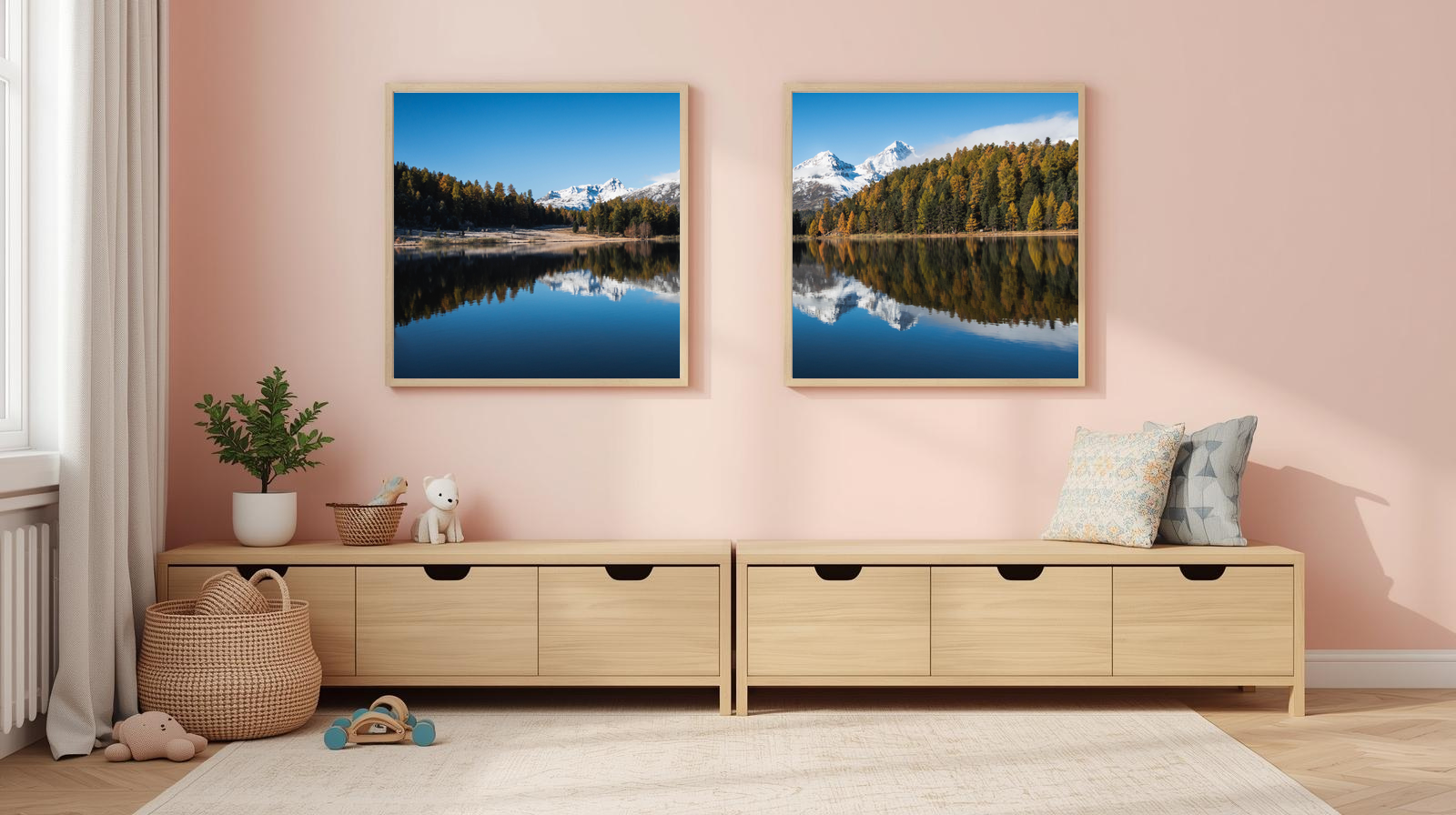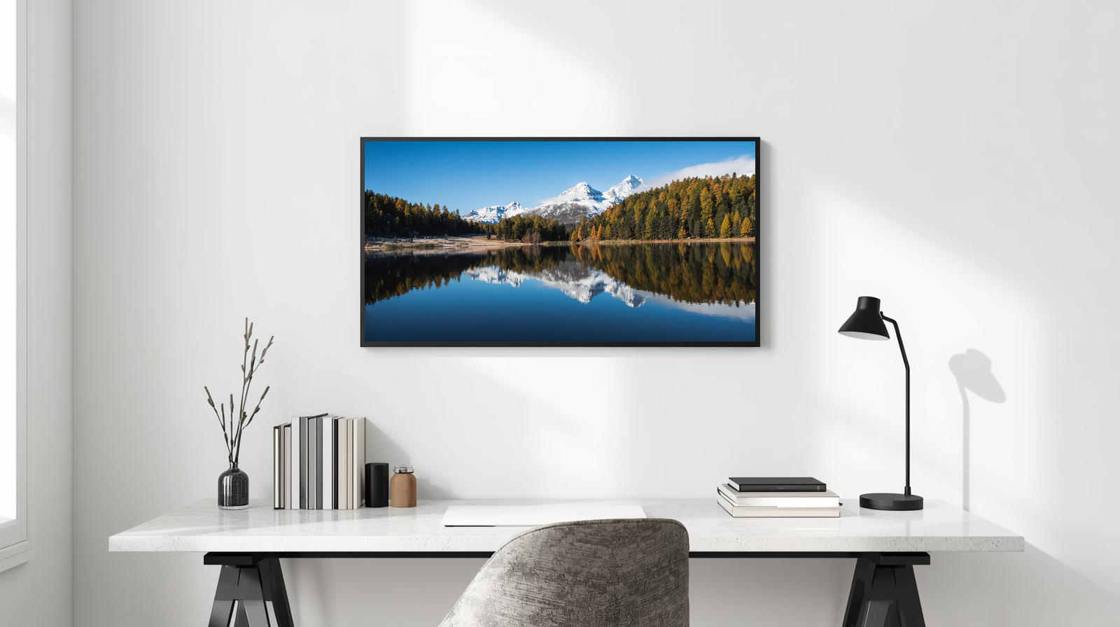 Bask in the glow of Alpine Reflections: Autumn Stillness. This authentic mountain photograph captures a serene alpine lake reflecting snow‑capped peaks, evergreen forest, and trees touched with autumn gold. The mirror‑like surface doubles the beauty of the scene, blending warm seasonal hues with the cool tones of sky and stone. Enhanced for clarity and depth, this piece evokes balance and tranquility, making it perfect for living rooms, meditation spaces, or rustic interiors seeking a natural accent.