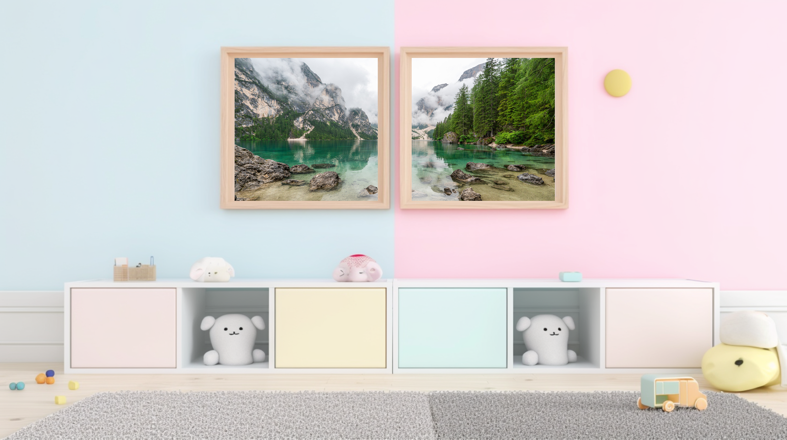Immerse yourself in Alpine Reflections: Emerald Veil. This authentic mountain photograph captures a turquoise alpine lake so clear that stones beneath the surface are visible, while its mirror‑like waters reflect towering peaks and dense green forest. Mist drifts across the mountains, softening their rugged forms and adding a sense of mystery to the scene. Enhanced for clarity and depth, this piece blends vibrancy with tranquility, making it perfect for living rooms, meditation spaces, or modern interiors seeking a natural statement.