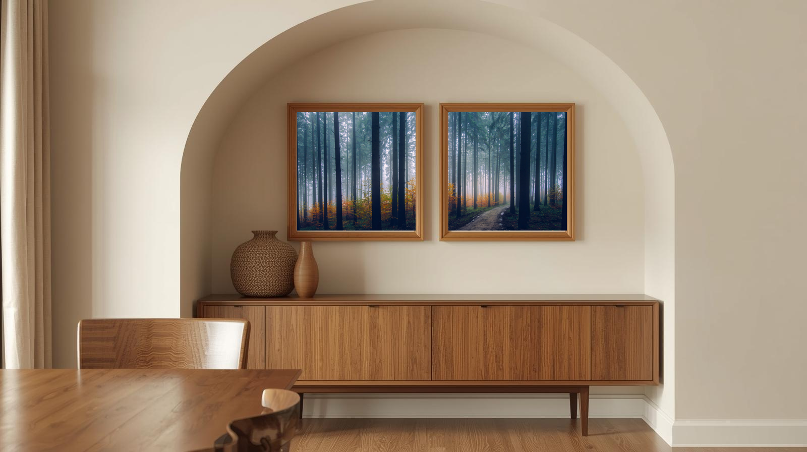 Step into the dreamlike calm of Woodland Passage: Embermist Trail. This authentic forest photograph captures a winding dirt path disappearing into the fog, framed by tall, slender trees rising into the mist. Vibrant orange and yellow foliage glows against the muted tones of moss and bark, creating a striking contrast that evokes both warmth and mystery. Enhanced for clarity and depth, the image preserves the textures of leaf, earth, and light, offering a scene that feels timeless and contemplative. Perfect for living rooms, meditation spaces, or rustic interiors, it brings the ethereal beauty of the woodland into your home.