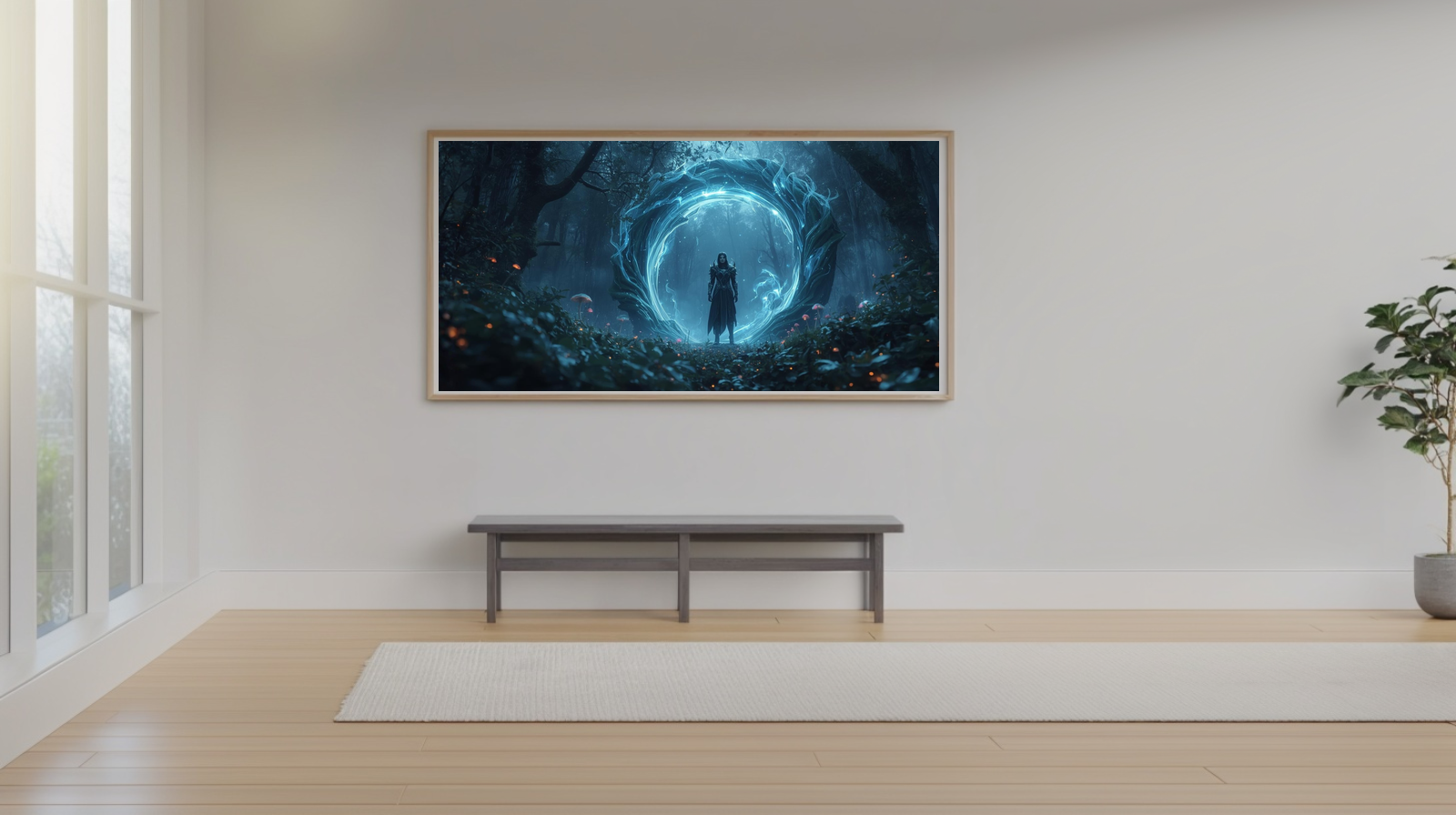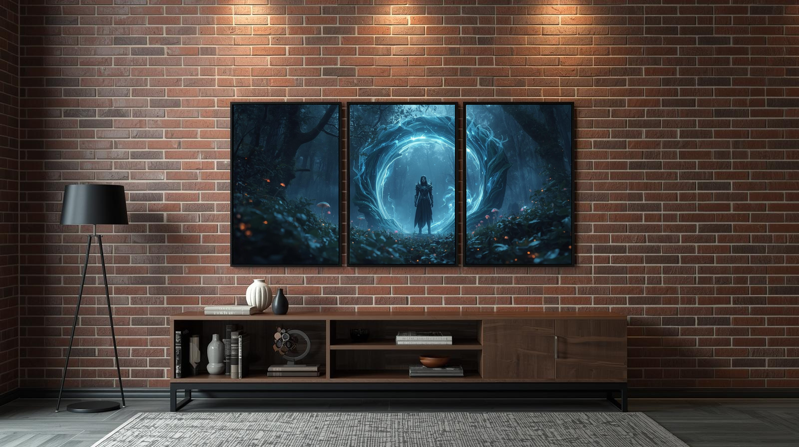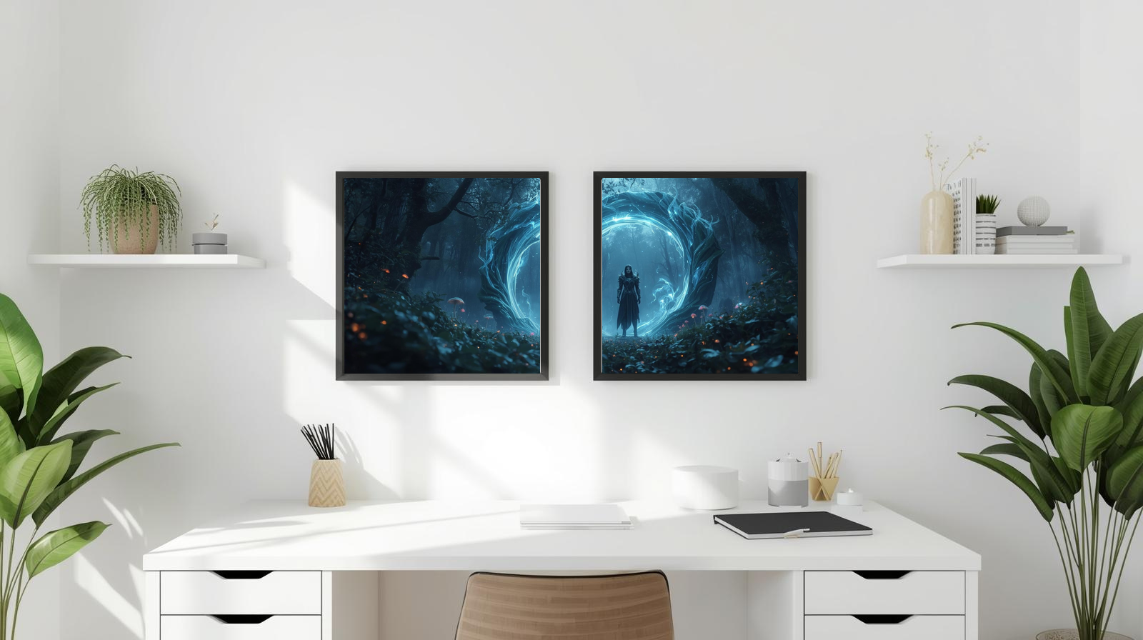 Enter the threshold of mystery with Guardians of the Realm: Arcane Bastion. This digital artwork depicts a cloaked guardian standing before a swirling, root‑framed portal of luminous blue energy. The dense forest glows with ethereal light, illuminating mushrooms, moss, and mist that cling to the ground. The figure’s stance is resolute, embodying the role of a sentinel guarding the gateway between worlds. Perfect for fans of fantasy, DND, and epic storytelling, this piece captures the essence of magic, guardianship, and otherworldly adventure.