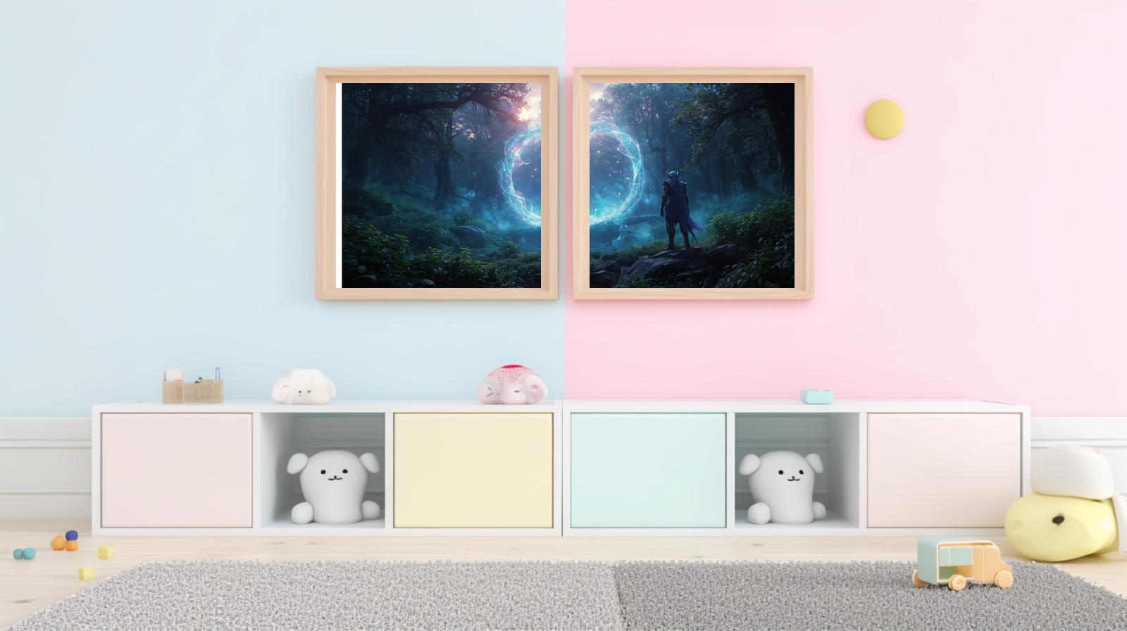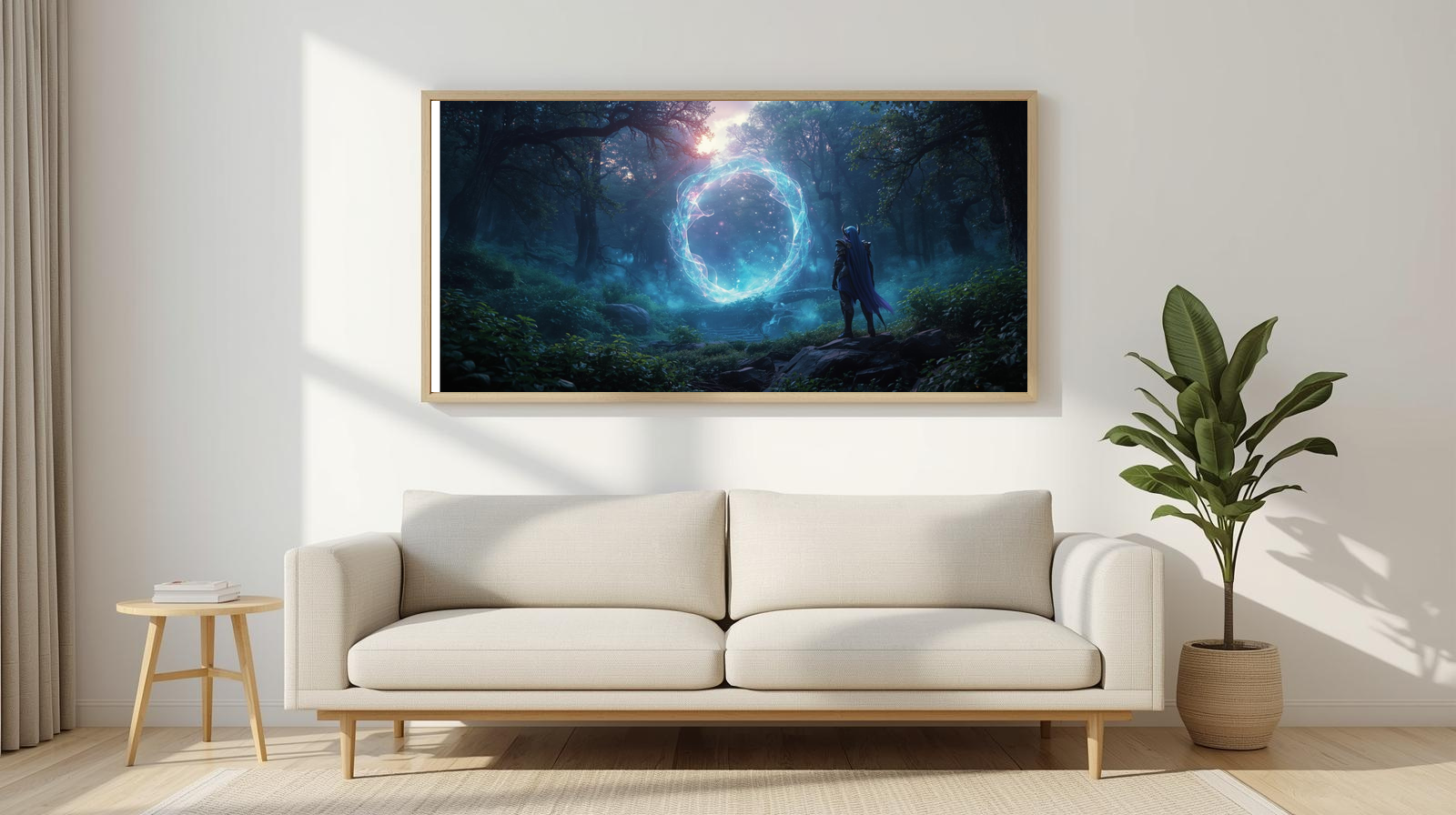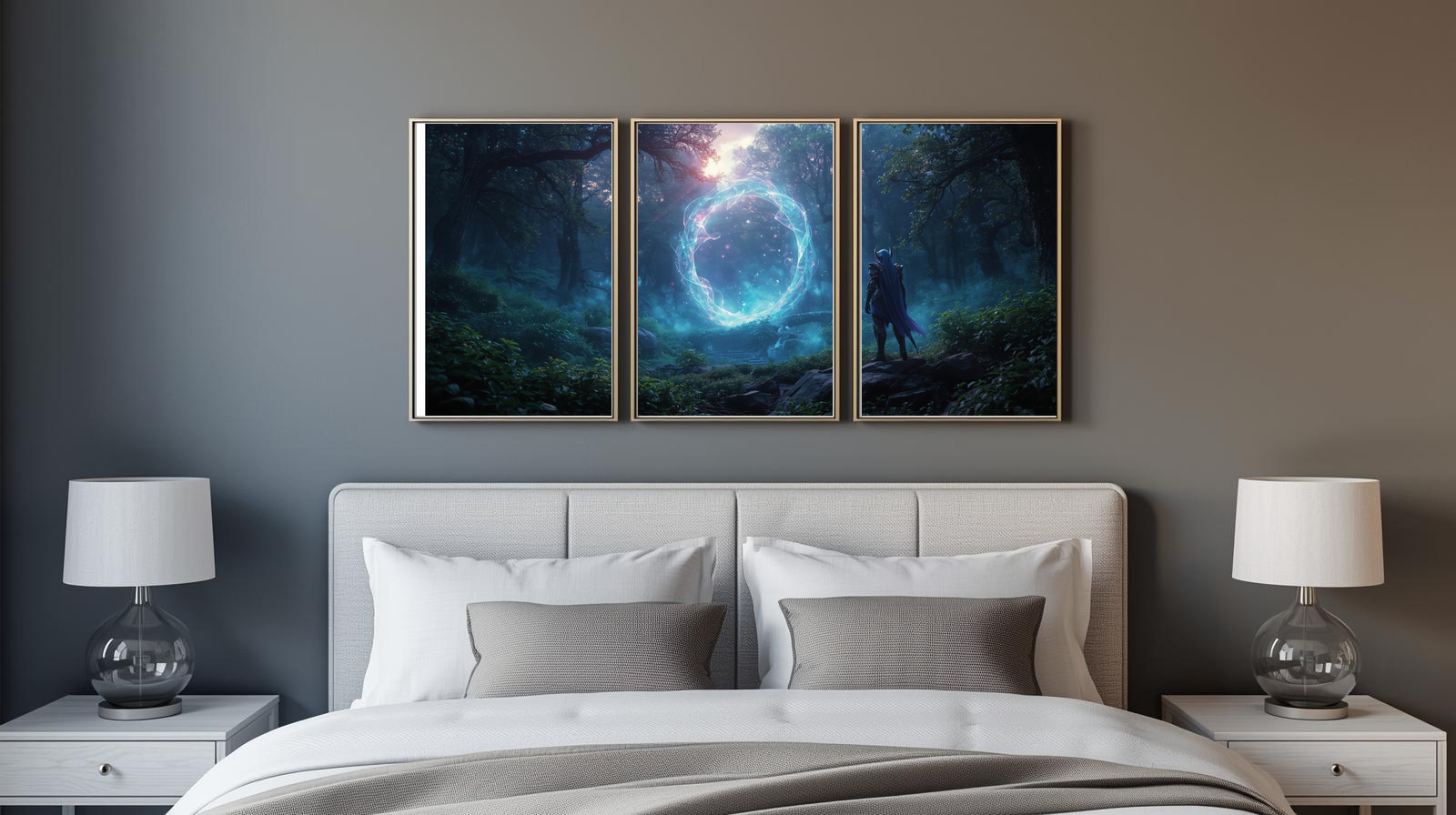 Step into the unknown with Guardians of the Realm: Stormforged Sentinel. This digital artwork depicts a lone armored guardian standing before a glowing, ethereal portal suspended in the heart of an ancient forest. The portal radiates strands of bluish light, illuminating the misty trees and moss‑covered rocks, while the warrior’s flowing cape and ornate armor catch the glow of its energy. The scene captures the tension of a threshold moment — a sentinel poised between realms, guarding the passage to worlds beyond. Perfect for fans of fantasy, DND, and epic storytelling, this piece brings mystery, magic, and adventure into any space.