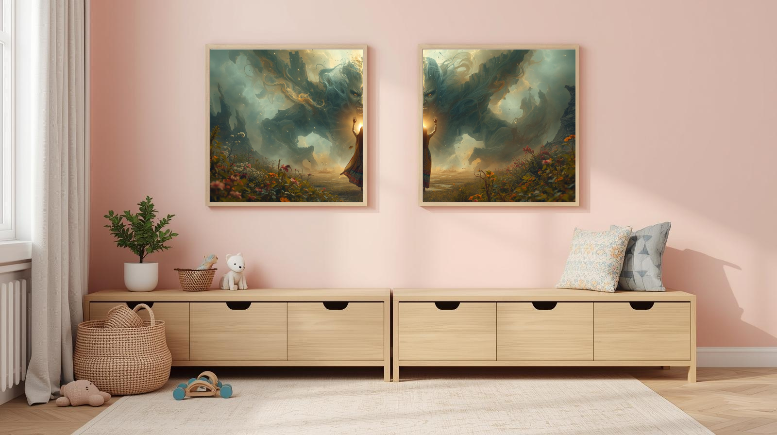 Step into a world of magic and myth with Guardians of the Realm: The Lightbearer. This digital artwork depicts a lone robed figure standing against a colossal storm‑born entity, its face formed of swirling clouds and glowing eyes. With arms raised, the guardian channels a radiant orb of light, casting brilliance against the darkness. The rocky terrain and otherworldly flowers heighten the sense of a mystical battlefield, where light and shadow collide in a timeless struggle. Perfect for fans of fantasy, DND, and epic storytelling, this piece brings cinematic drama and heroic energy to any space.