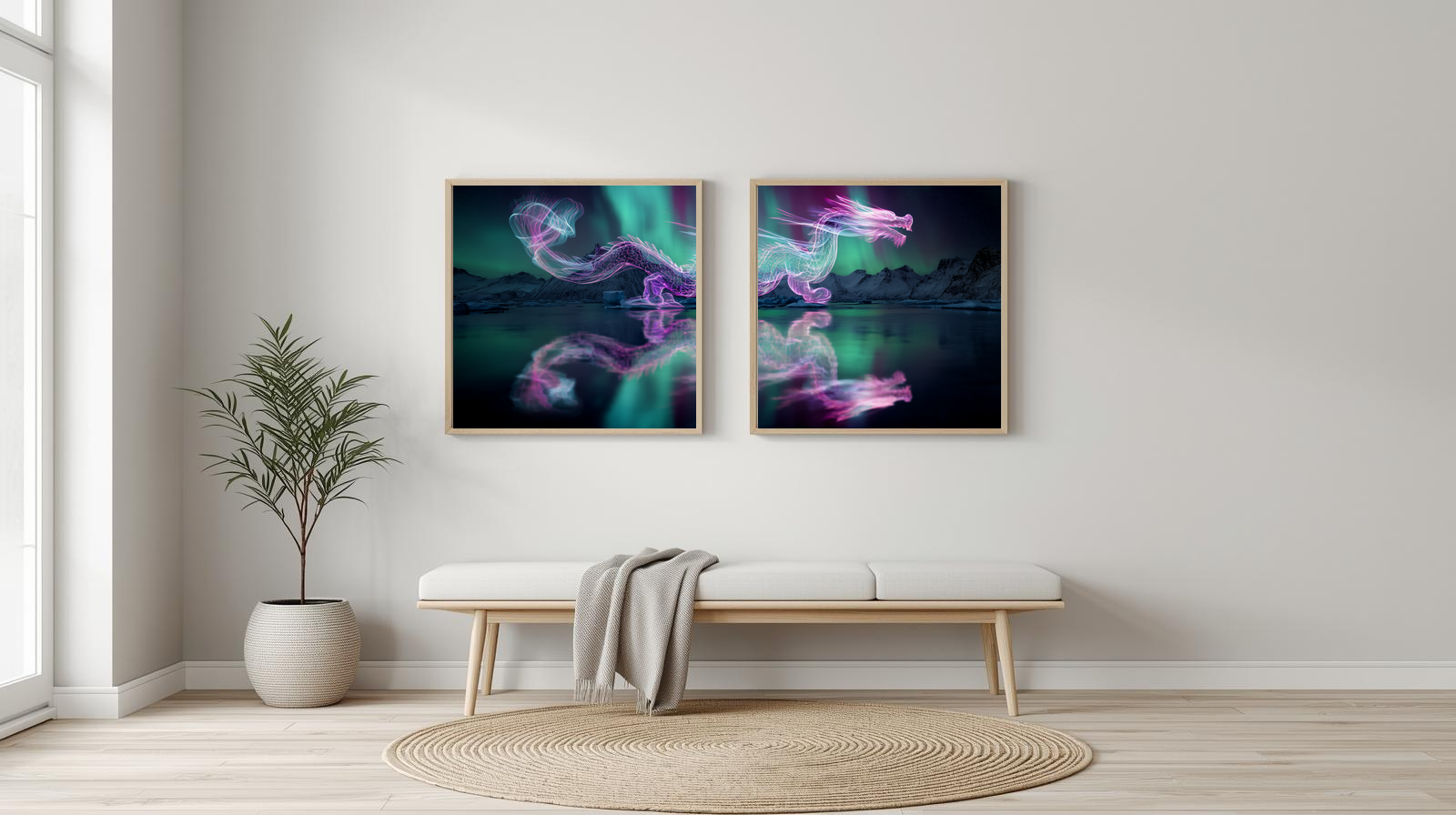 Bring the wonder of the cosmos into your home with Mystic Serpents: Eclipse Serpent. This digital artwork portrays a luminous dragon woven from trails of light, soaring above still waters beneath a sky alive with the aurora borealis. Snow‑capped mountains frame the scene, while the dragon’s reflection shimmers across the surface, amplifying its ethereal presence. A fusion of natural beauty and mythic imagination, this piece evokes awe, mystery, and transcendence — perfect for creating a bold, otherworldly atmosphere in any space.