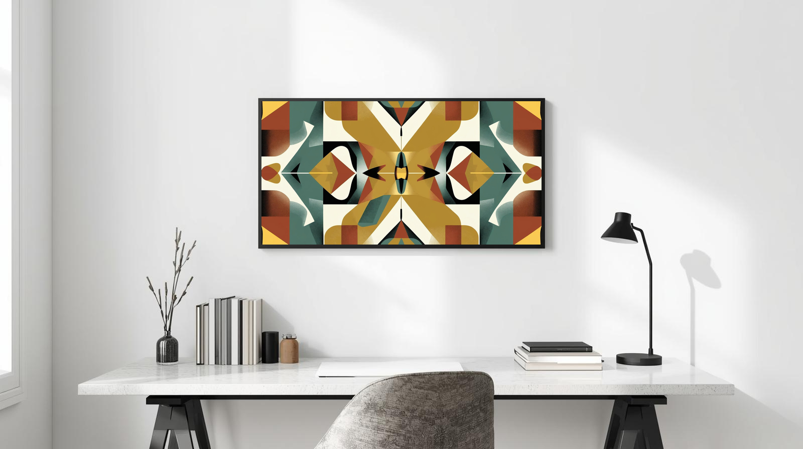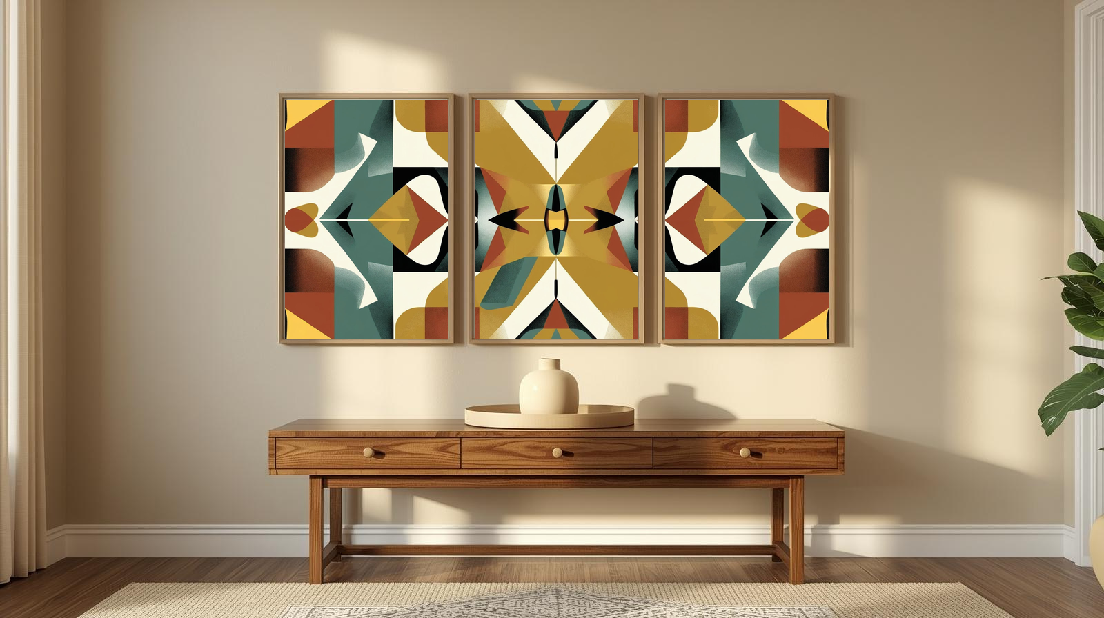 Bring timeless design into your home with Mid Century Modern Geometric: Symmetry in Motion. This digital artwork features a bold, mirrored composition of triangles, rectangles, and curved forms arranged in perfect balance. A retro palette of mustard yellow, teal green, burnt orange, black, and white creates striking contrast, while the central vertical axis anchors the design with a sense of harmony and rhythm. Perfect for lovers of mid‑century modern style, this piece adds a sophisticated, abstract edge to any space.