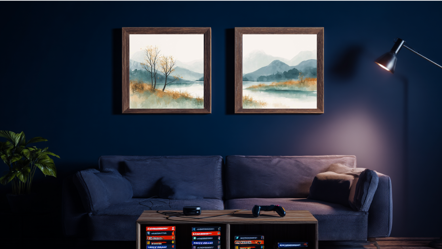Breathe in the stillness of Serenity in Ink: Autumn Reflection. This digital artwork portrays a tranquil lake edged with golden grasses and sparse autumn trees, their reflections shimmering across calm water. Misty mountains rise in the distance, painted in soft blues and grays that dissolve into the pale sky. Rendered in a watercolor style inspired by Japandi minimalism, this piece balances warmth and quiet, making it ideal for bedrooms, living rooms, or meditation spaces.
