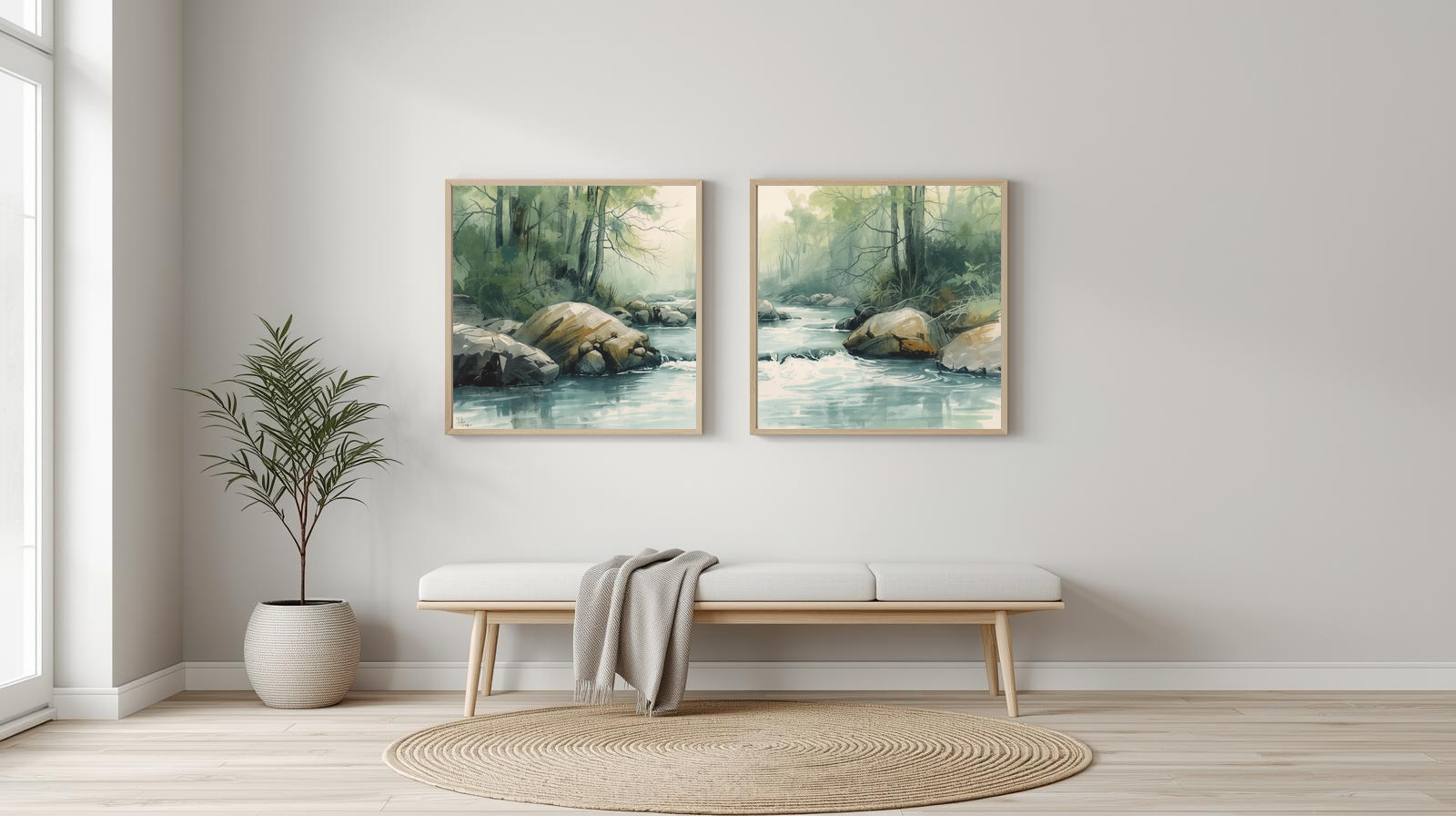 Step into the hush of Serenity in Ink: Misty Haven. This digital artwork portrays a forest stream winding between smooth river stones and slender trees, dissolving into a veil of morning mist. Painted in soft watercolor washes with Japandi minimalism, it captures the balance of flowing water, grounded stone, and ethereal light. Perfect for meditation rooms, bedrooms, or tranquil living spaces, this piece brings a sense of refuge and timeless calm to any wall.