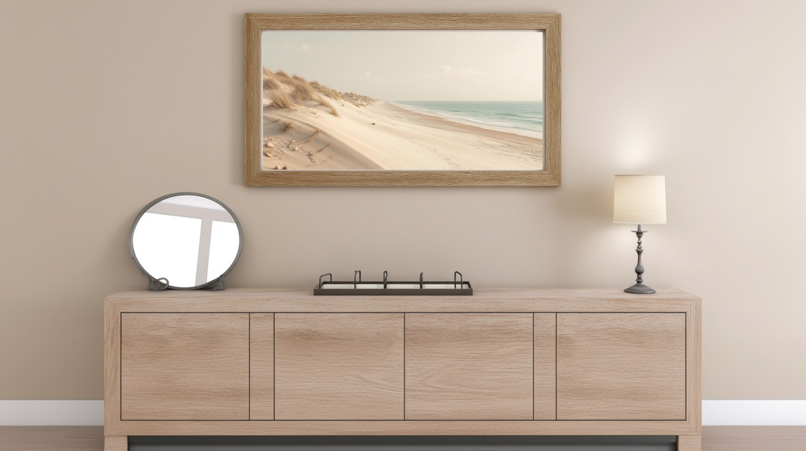 Bring the calm of the coast into your home with Shoreline Serenity: Dune Horizon. This digital artwork highlights the gentle sweep of sandy dunes, touched with sparse grasses, leading the eye toward the turquoise ocean and soft horizon beyond. Bathed in warm, tranquil light, this piece captures the quiet beauty of nature’s open spaces — perfect for creating a serene, modern atmosphere in any room.