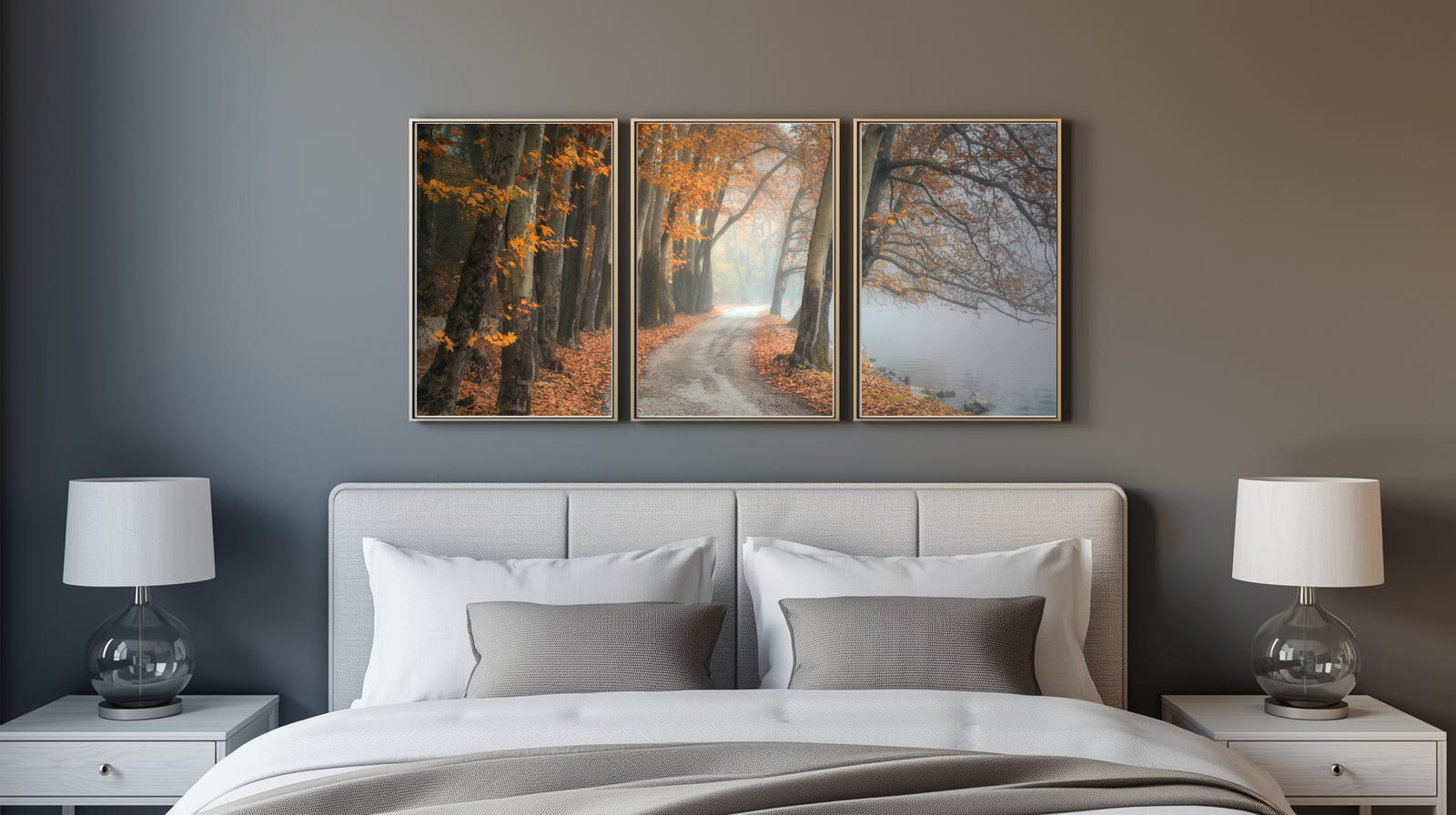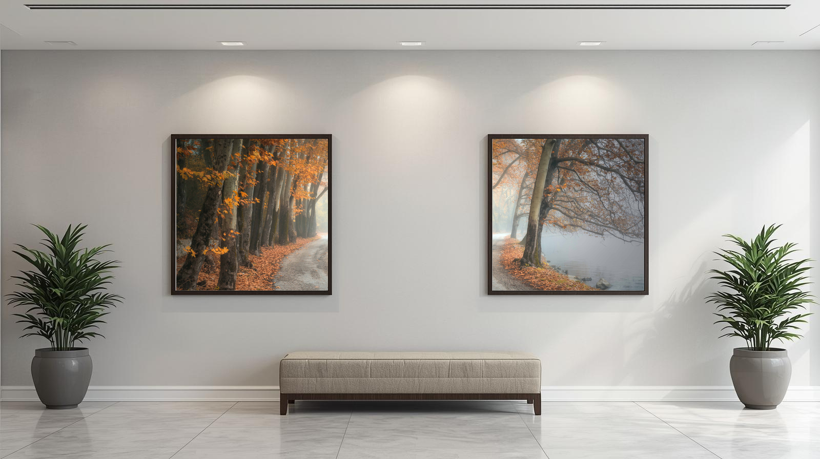 Wander through the calm of Woodland Passage: Amber Drift. This authentic forest photograph captures a leaf‑strewn path winding beside still waters, framed by trees glowing in shades of orange and brown. Mist drifts across the background, softening the scene and adding depth, while the leaning branches create a natural canopy overhead. Enhanced for clarity and depth, the image preserves the textures of leaf, bark, and water, evoking both serenity and reflection. Perfect for living rooms, meditation spaces, or rustic interiors, it brings the quiet poetry of autumn into your home.