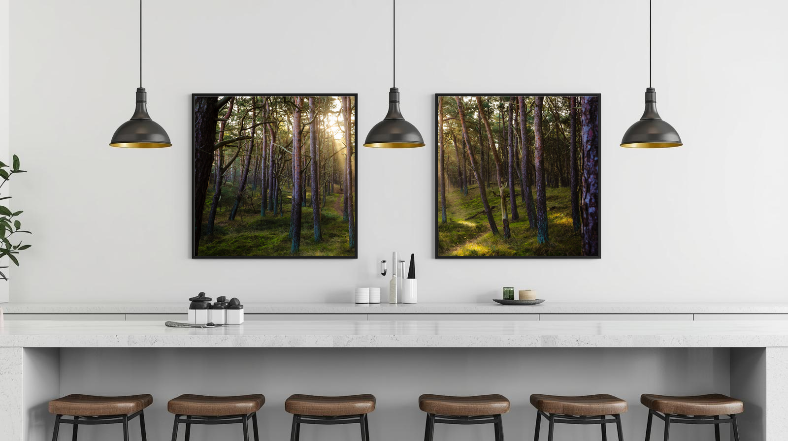 Breathe in the stillness of Woodland Passage: Sunveil Pines. This authentic forest photograph captures a narrow dirt path winding through a grove of slender pines, their trunks rising tall and close together. A carpet of moss and grass softens the forest floor, while golden sunlight filters through the canopy, casting long shadows and illuminating the trail with a warm, ethereal glow. Enhanced for clarity and depth, the image preserves the textures of bark, moss, and light, evoking both serenity and quiet exploration. Perfect for living rooms, meditation spaces, or rustic interiors, it brings the timeless calm of the woodland into your home.